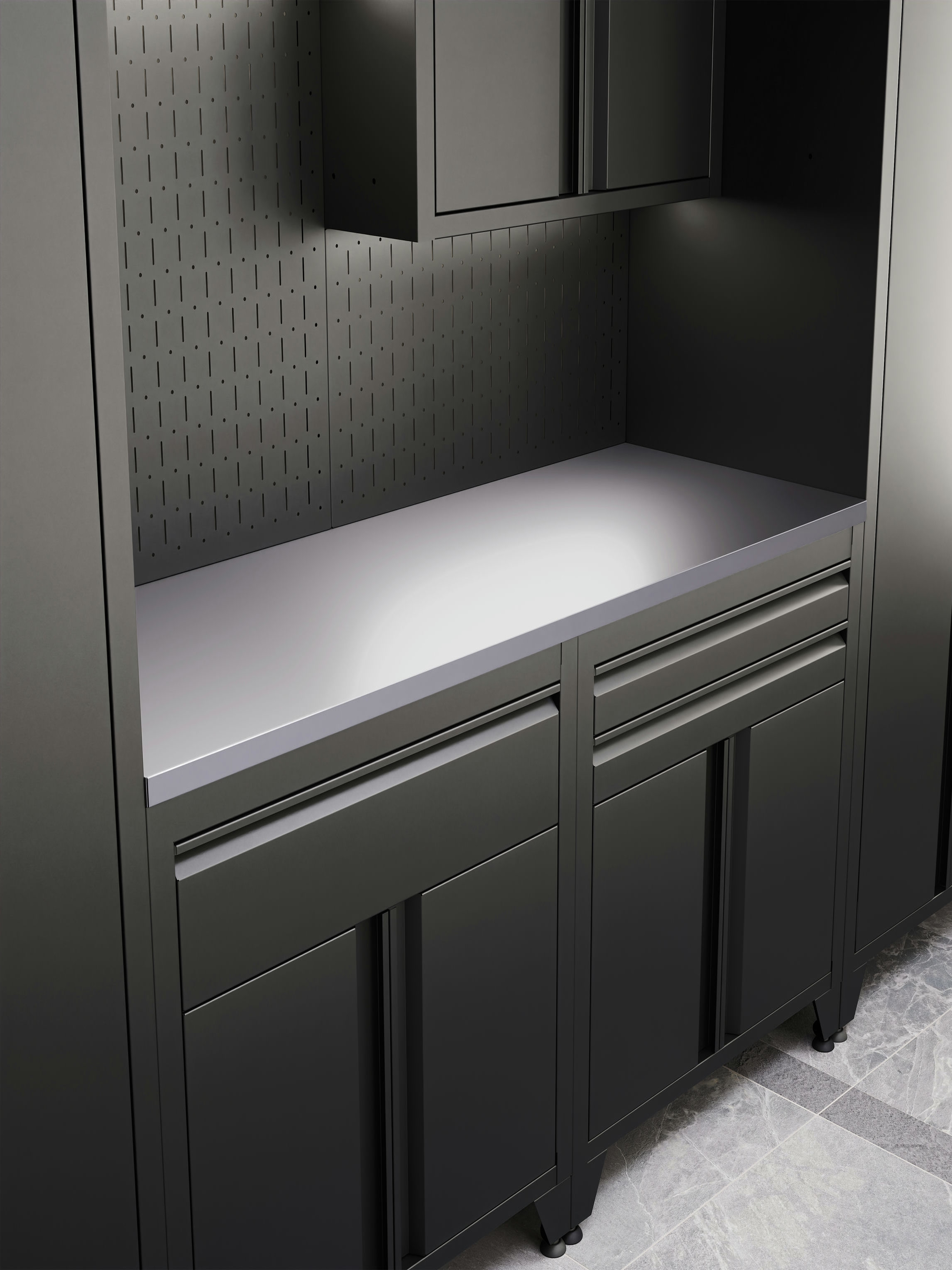 - имеют 25-миллиметровую столешницу, покрытую оцинкованным листом, изготовлены из стали с матовым чёрным порошковым покрытием;