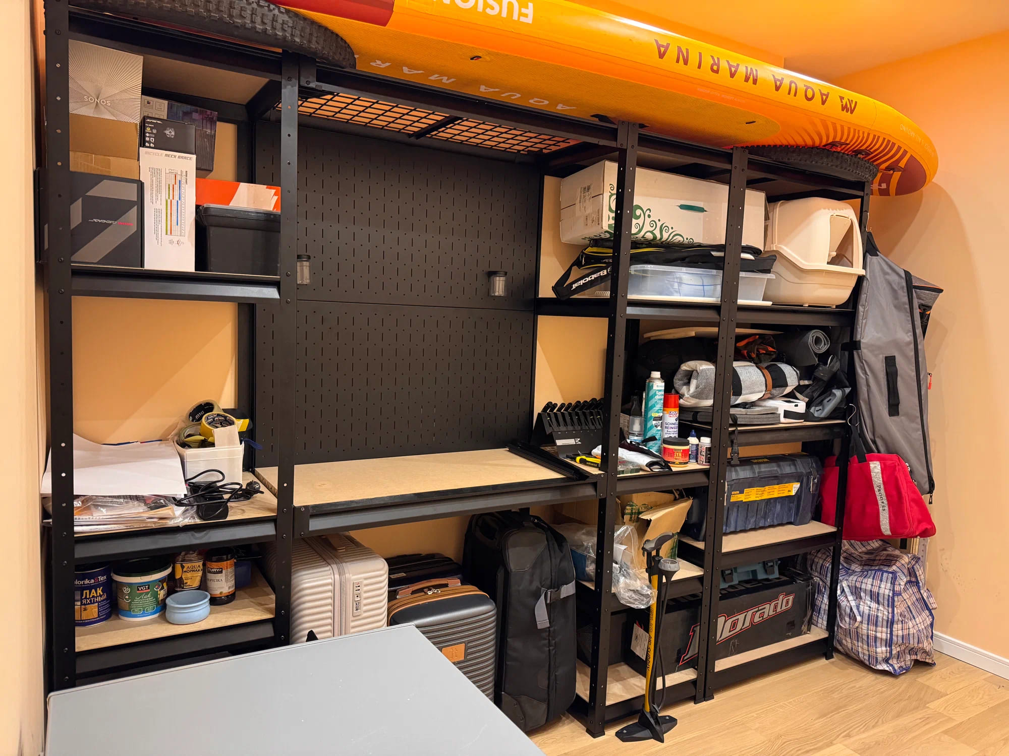Металлические полки из сетки 50×50 мм (пруток 5 мм) — вентиляция и лёгкий доступ к инструментам.
