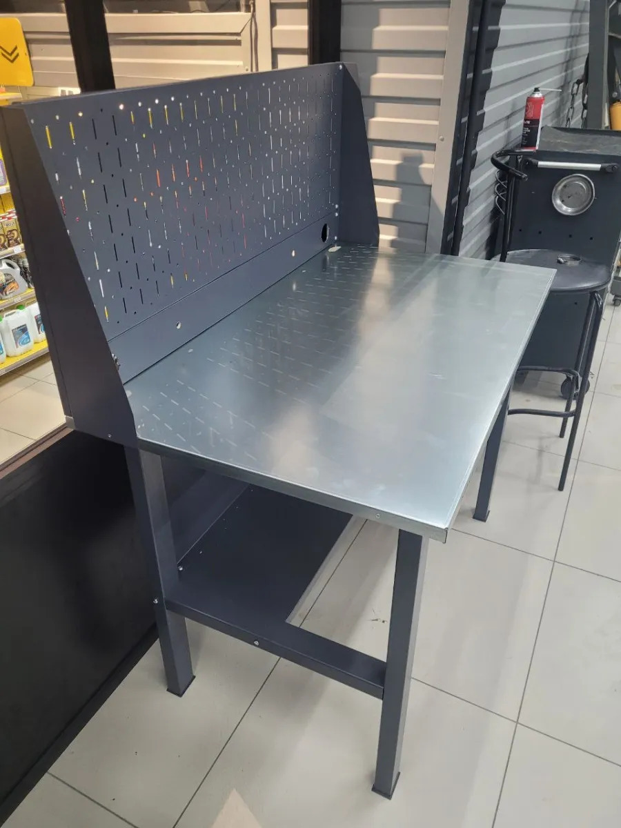 Основой верстака служит надежная столешница, выполненная из фанерной плиты толщиной 24 мм, которая закрыта коробом из оцинкованного листа толщиной 1,2 мм. Такое решение обеспечивает исключительную прочность конструкции. Столешница имеет идеально ровную поверхность без каких-либо выступающих элементов (болтов, заклепок), что создает максимальный комфорт при работе.