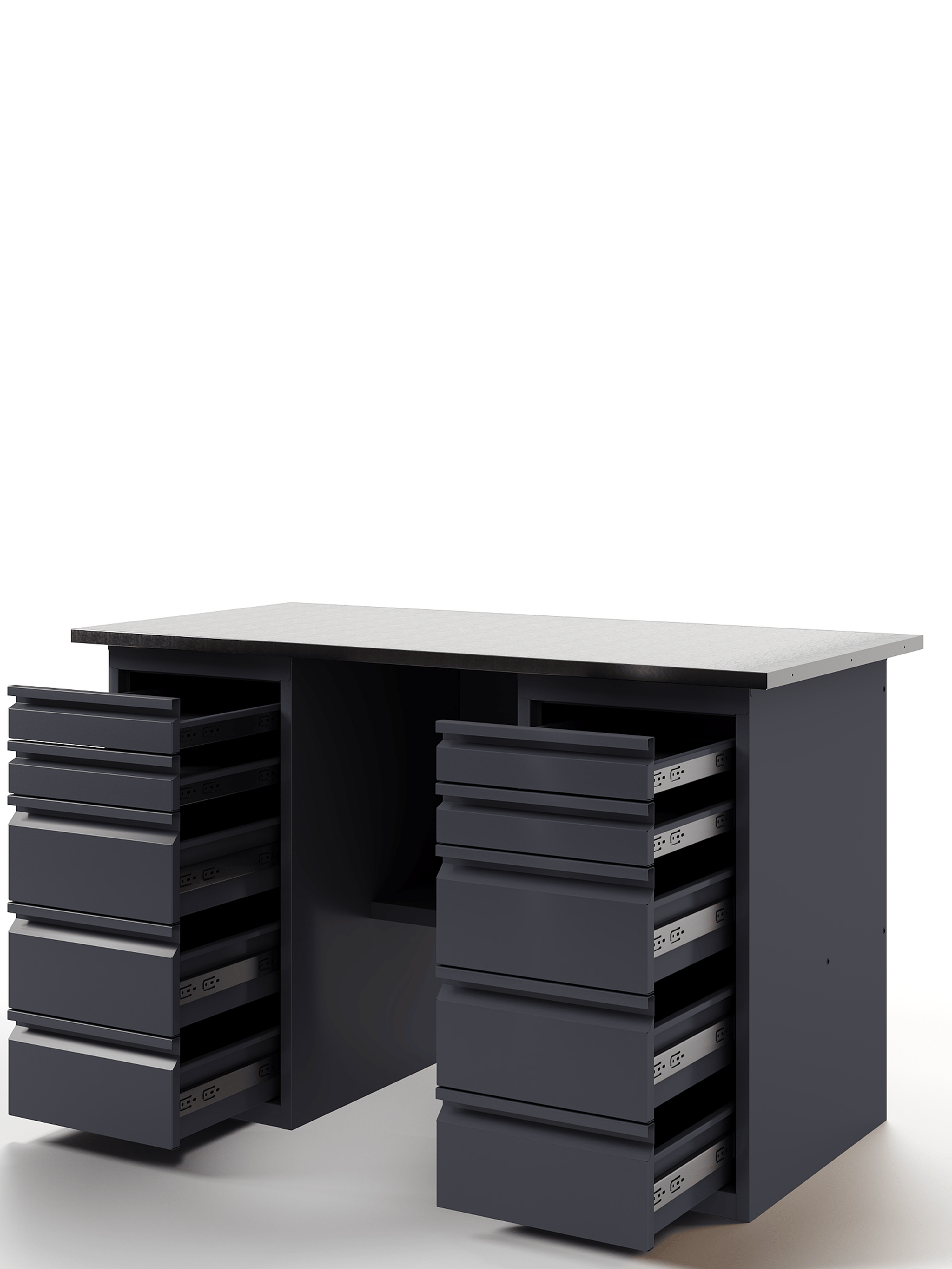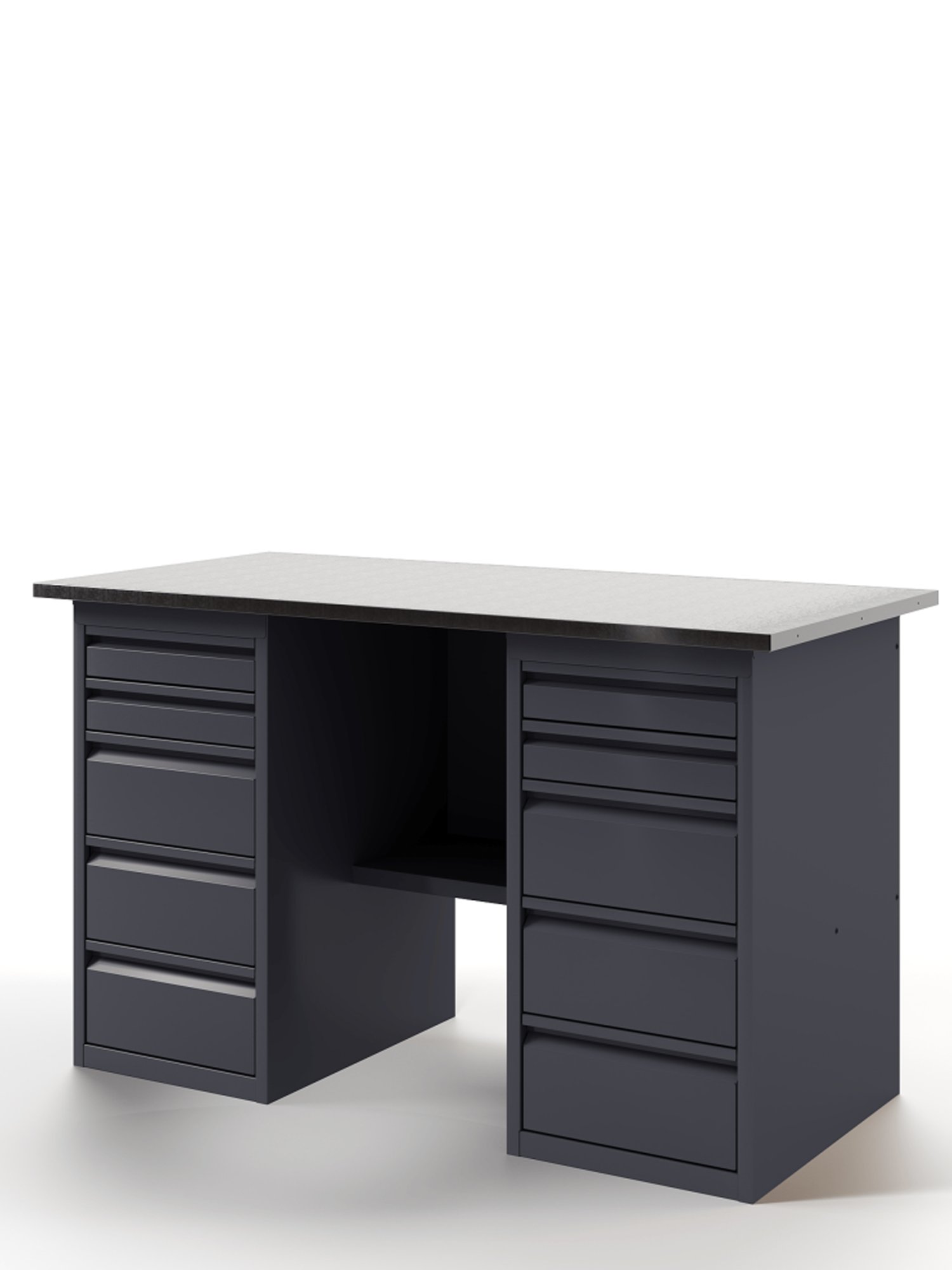 Основой верстака служит надежная столешница, выполненная из МДФ плиты толщиной 24 мм, которая закрыта коробом из оцинкованного листа толщиной 1,2 мм. Такое решение обеспечивает исключительную прочность конструкции. Столешница имеет идеально ровную поверхность без каких-либо выступающих элементов (болтов, заклепок), что создает максимальный комфорт при работе.