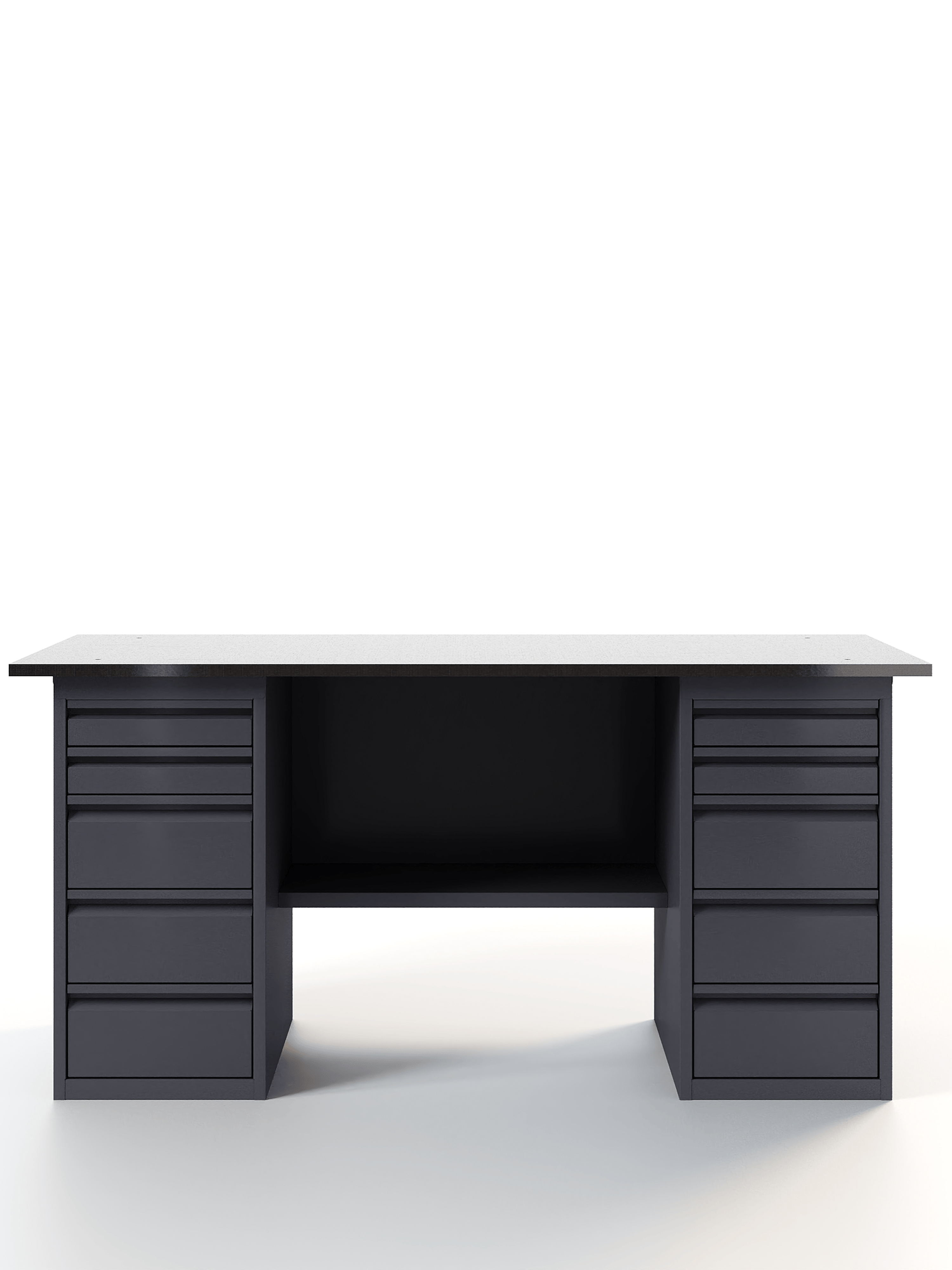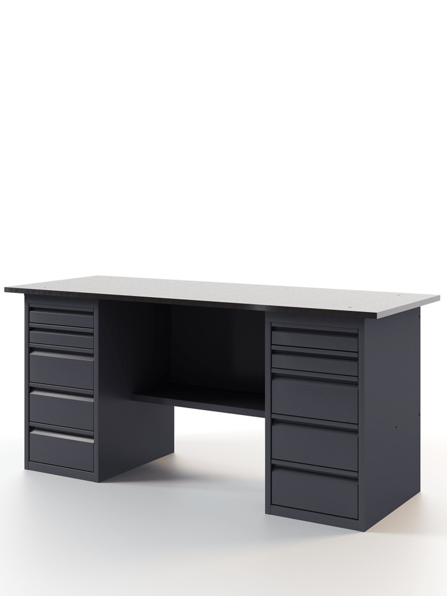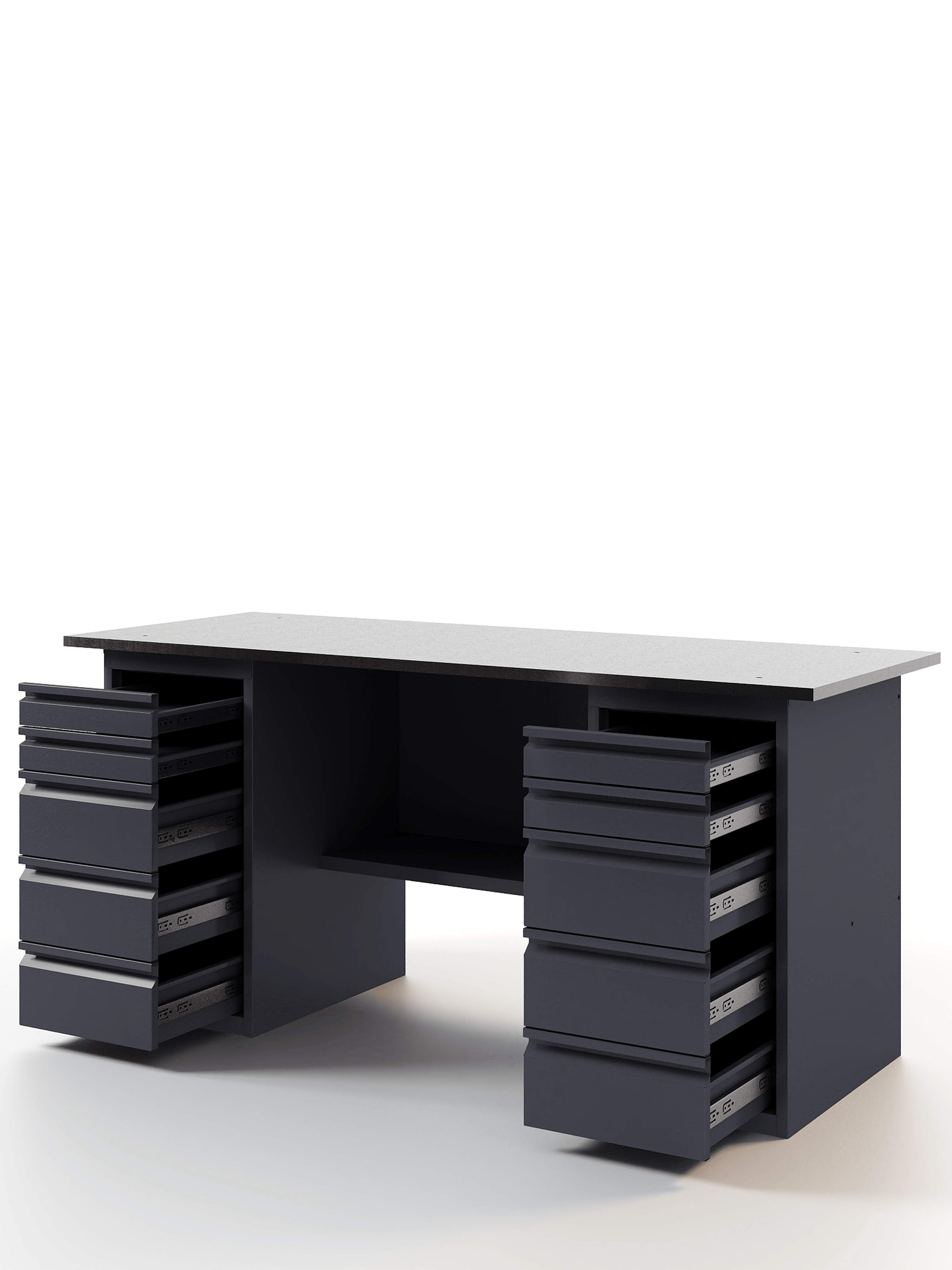 Основой верстака служит надежная столешница, выполненная из МДФ плиты толщиной 24 мм, которая закрыта коробом из оцинкованного листа толщиной 1,2 мм. Такое решение обеспечивает исключительную прочность конструкции. Столешница имеет идеально ровную поверхность без каких-либо выступающих элементов (болтов, заклепок), что создает максимальный комфорт при работе.