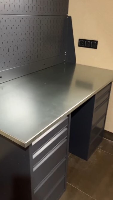 Основой верстака служит надежная столешница, выполненная из фанерной плиты толщиной 24 мм, которая закрыта коробом из оцинкованного листа толщиной 1,2 мм. Такое решение обеспечивает исключительную прочность конструкции. Столешница имеет идеально ровную поверхность без каких-либо выступающих элементов (болтов, заклепок), что создает максимальный комфорт при работе.