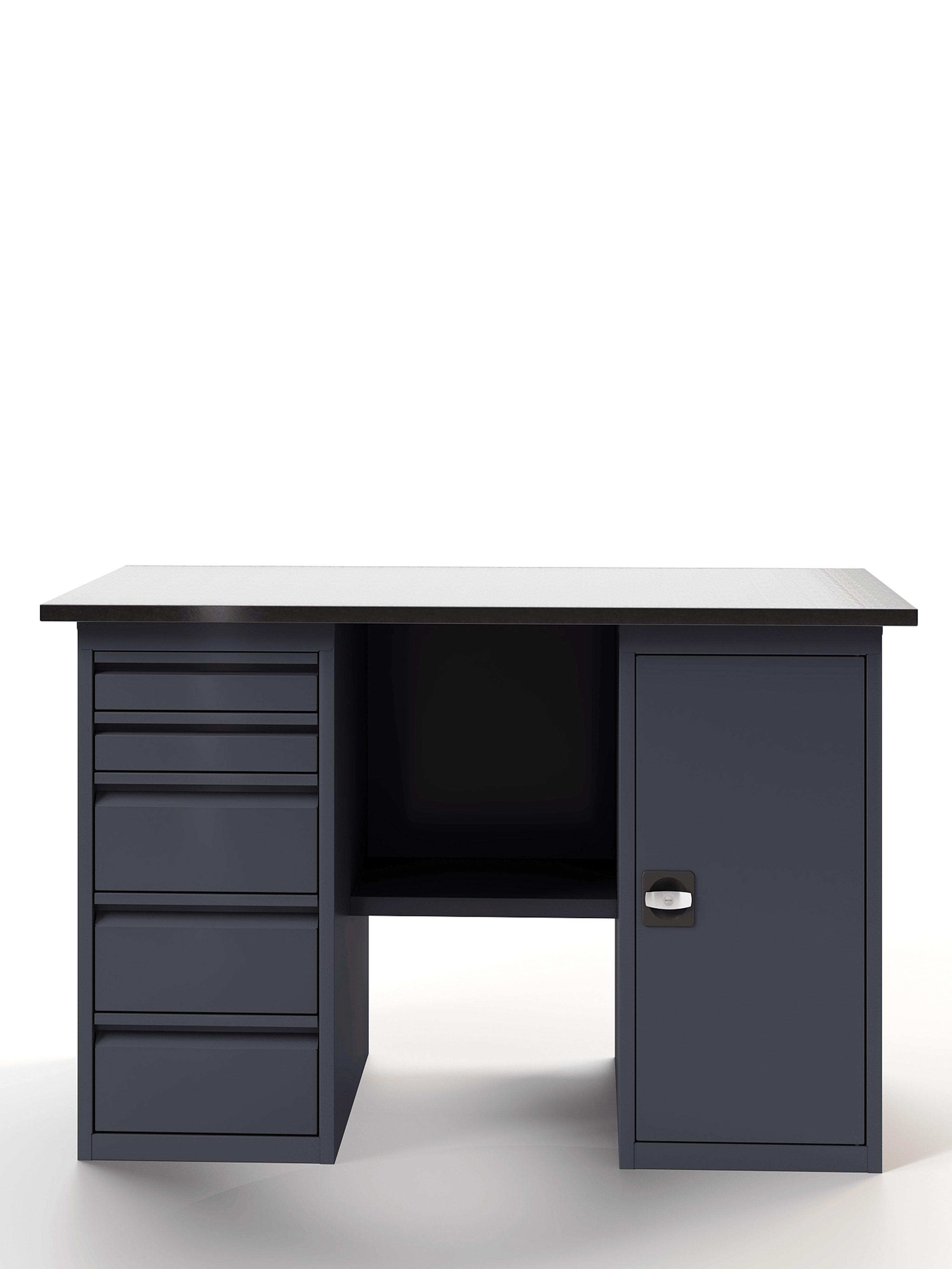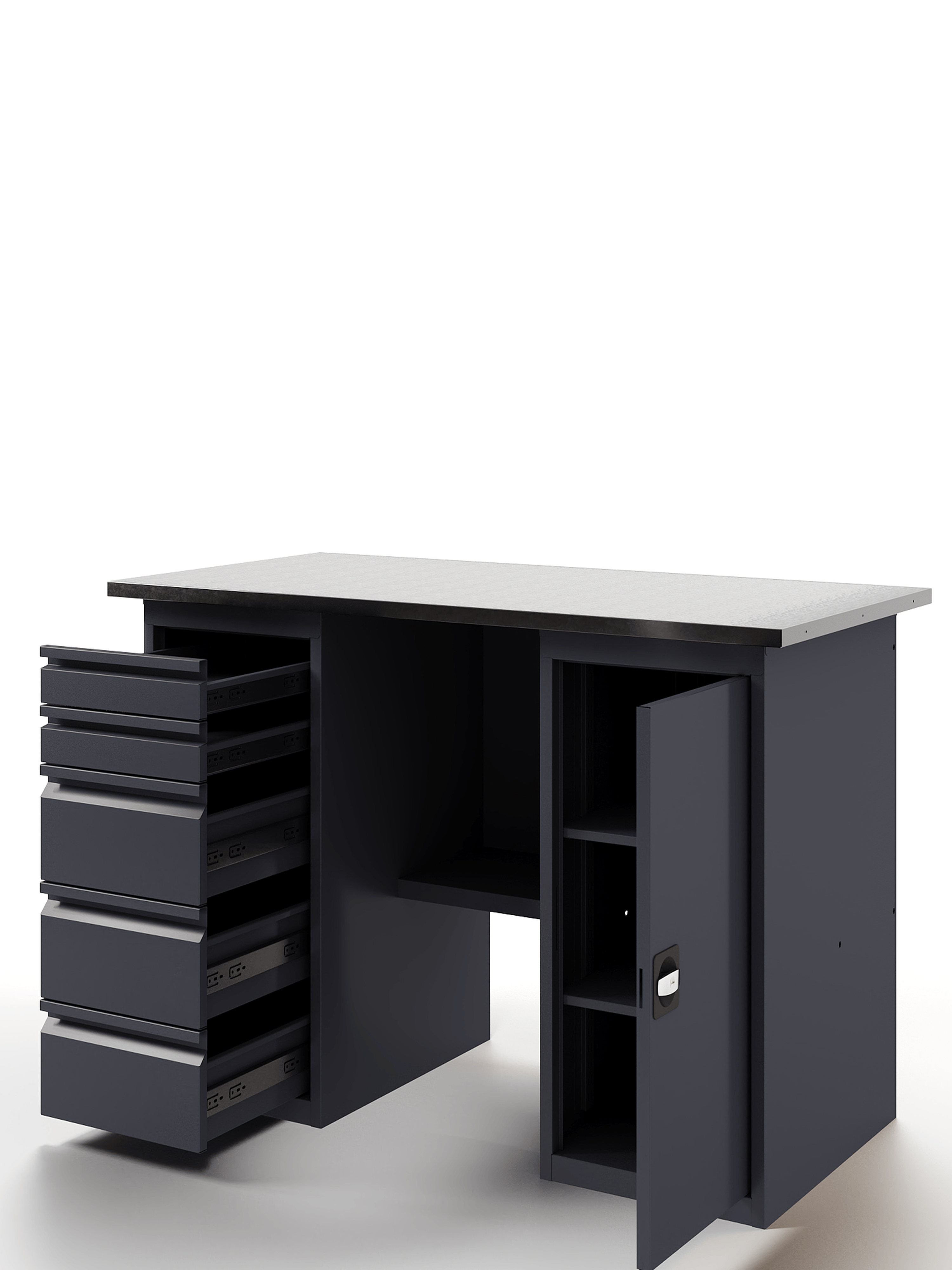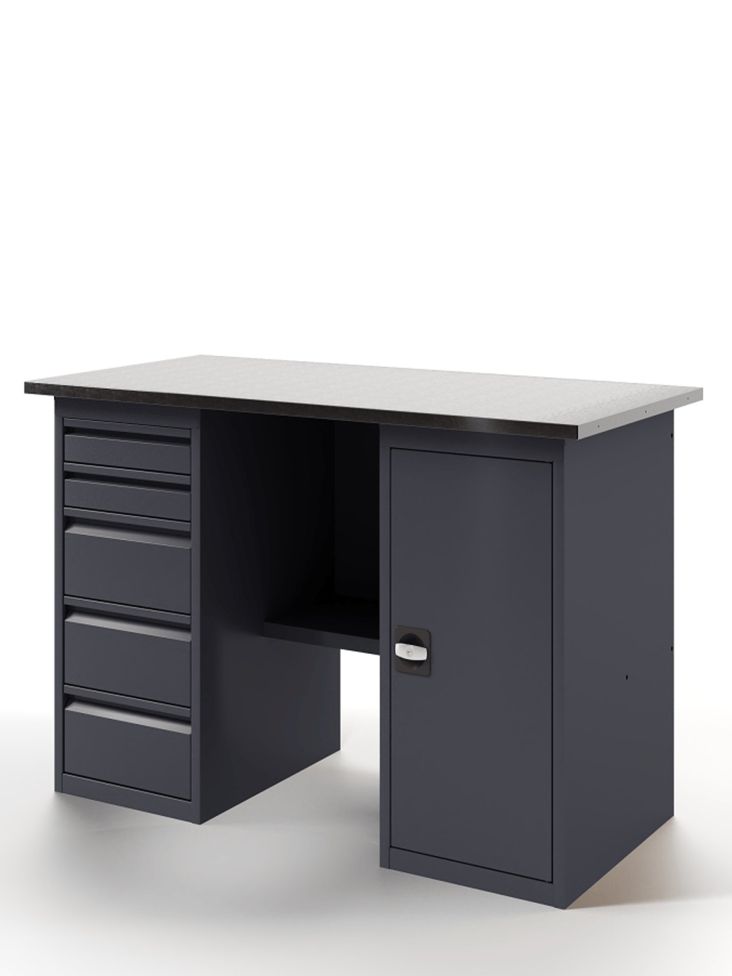 Основой верстака служит надежная столешница, выполненная из фанеры толщиной 24 мм, которая закрыта коробом из оцинкованного листа толщиной 1,2 мм. Такое решение обеспечивает исключительную прочность конструкции. Столешница имеет идеально ровную поверхность без каких-либо выступающих элементов (болтов, заклепок), что создает максимальный комфорт при работе.