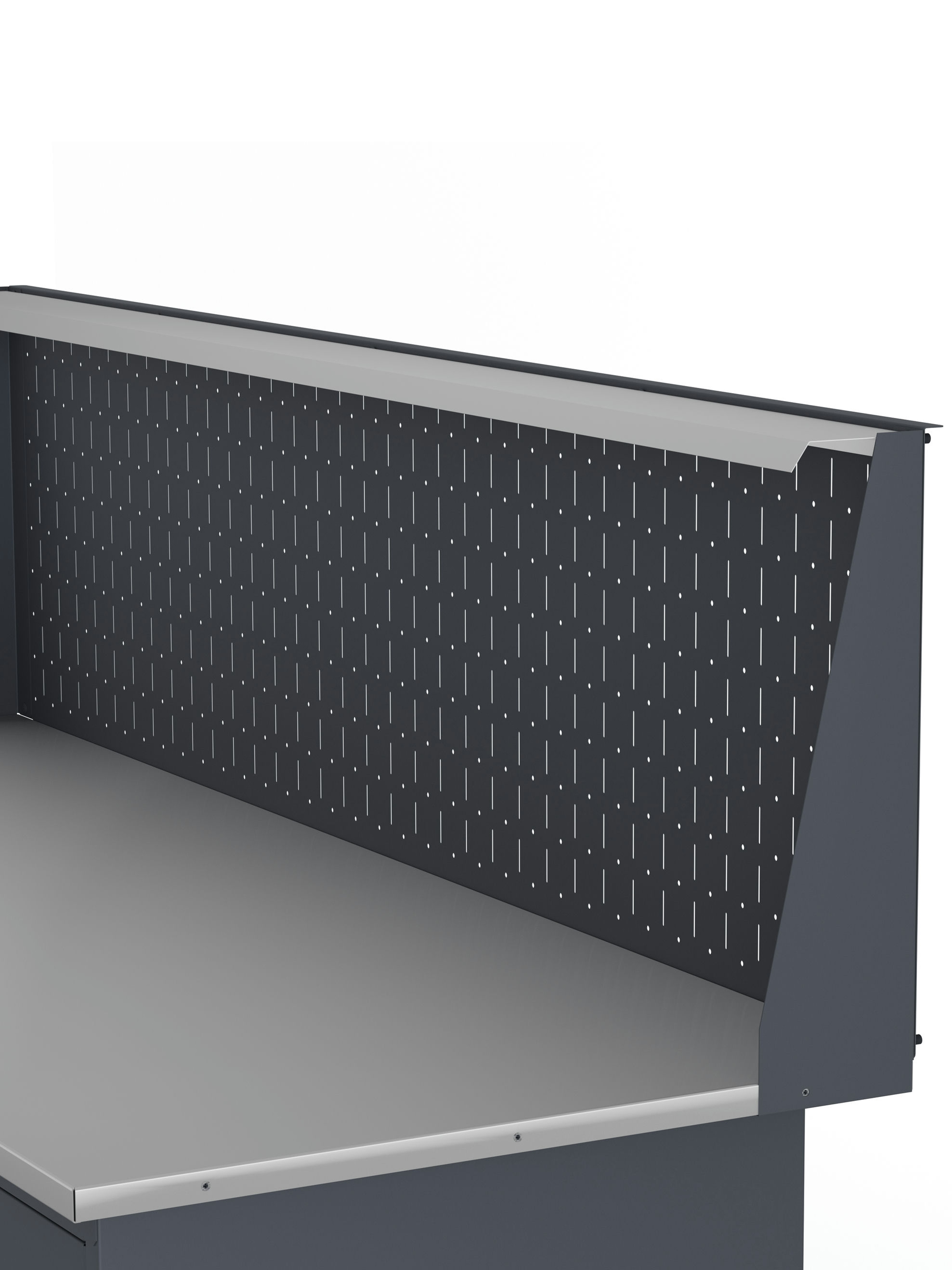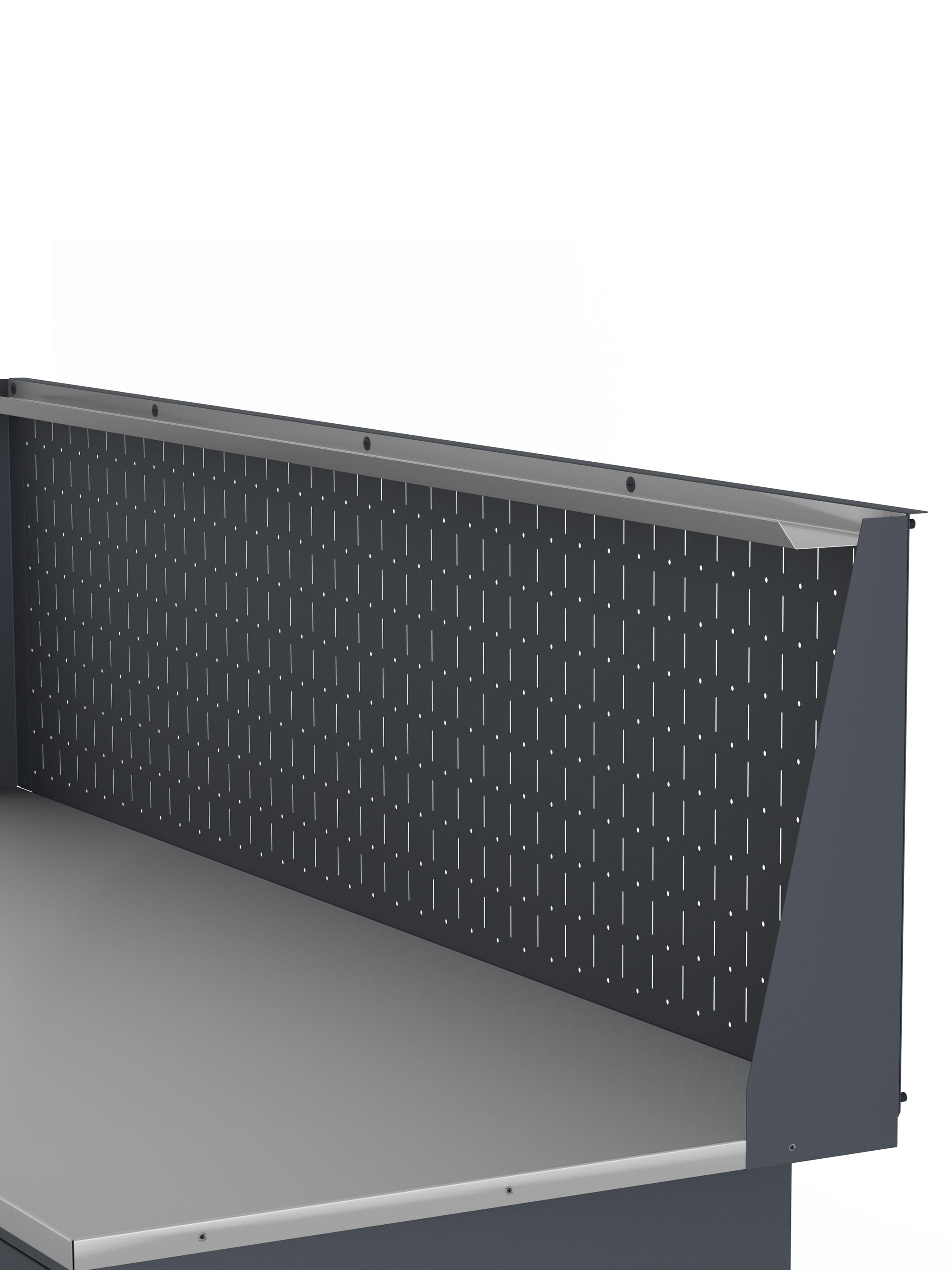 Основой верстака служит надежная столешница, выполненная из МДФ плиты толщиной 24 мм, которая закрыта коробом из оцинкованного листа толщиной 1,2 мм. Такое решение обеспечивает исключительную прочность конструкции. Столешница имеет идеально ровную поверхность без каких-либо выступающих элементов (болтов, заклепок), что создает максимальный комфорт при работе.