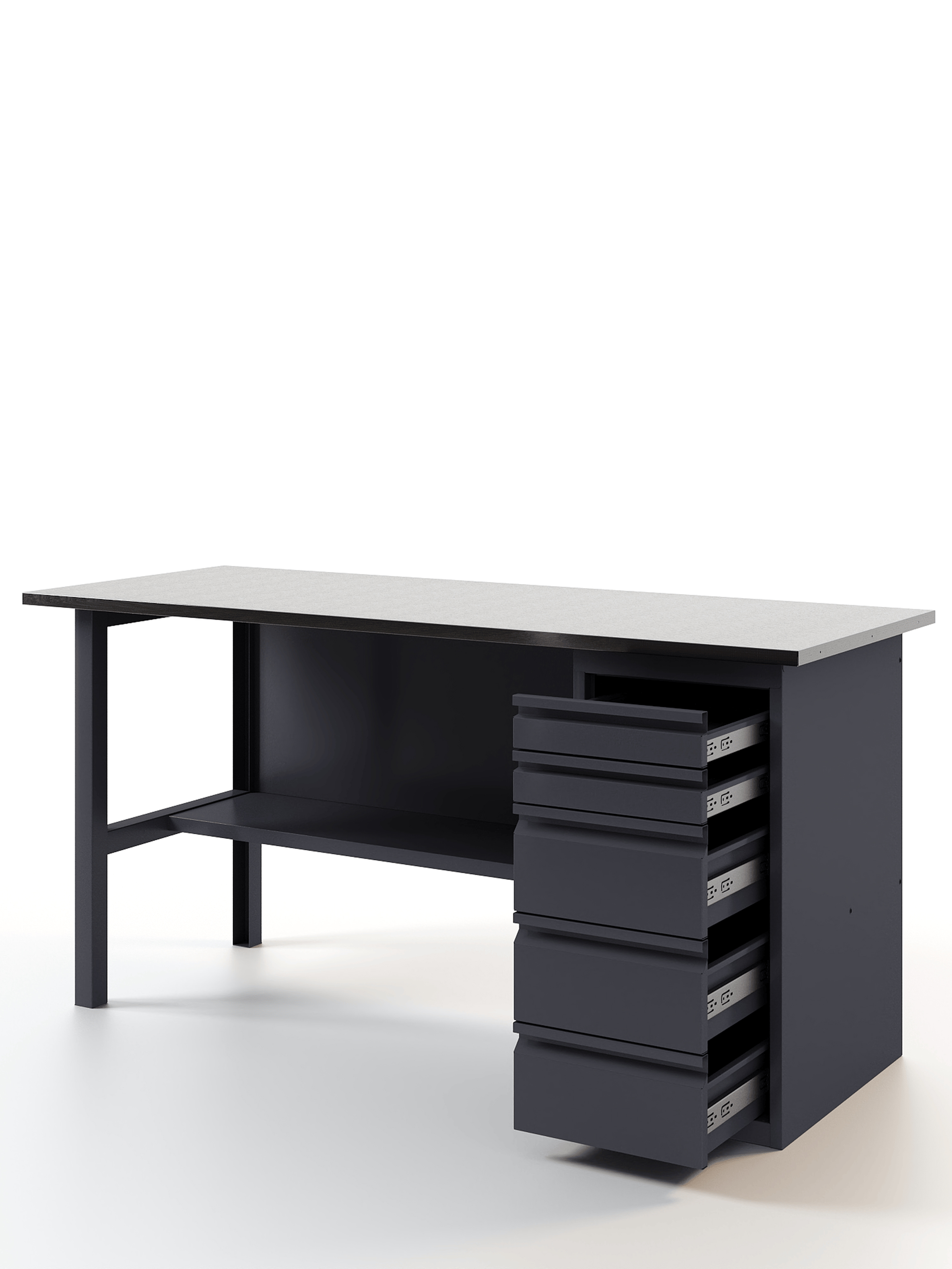 Основой верстака служит надежная столешница, выполненная из МДФ толщиной 24 мм, которая закрыта коробом из оцинкованного листа толщиной 1,2 мм. Такое решение обеспечивает исключительную прочность конструкции. Столешница имеет идеально ровную поверхность без каких-либо выступающих элементов (болтов, заклепок), что создает максимальный комфорт при работе.