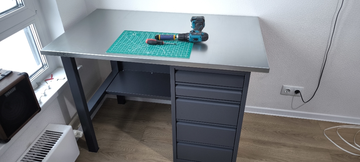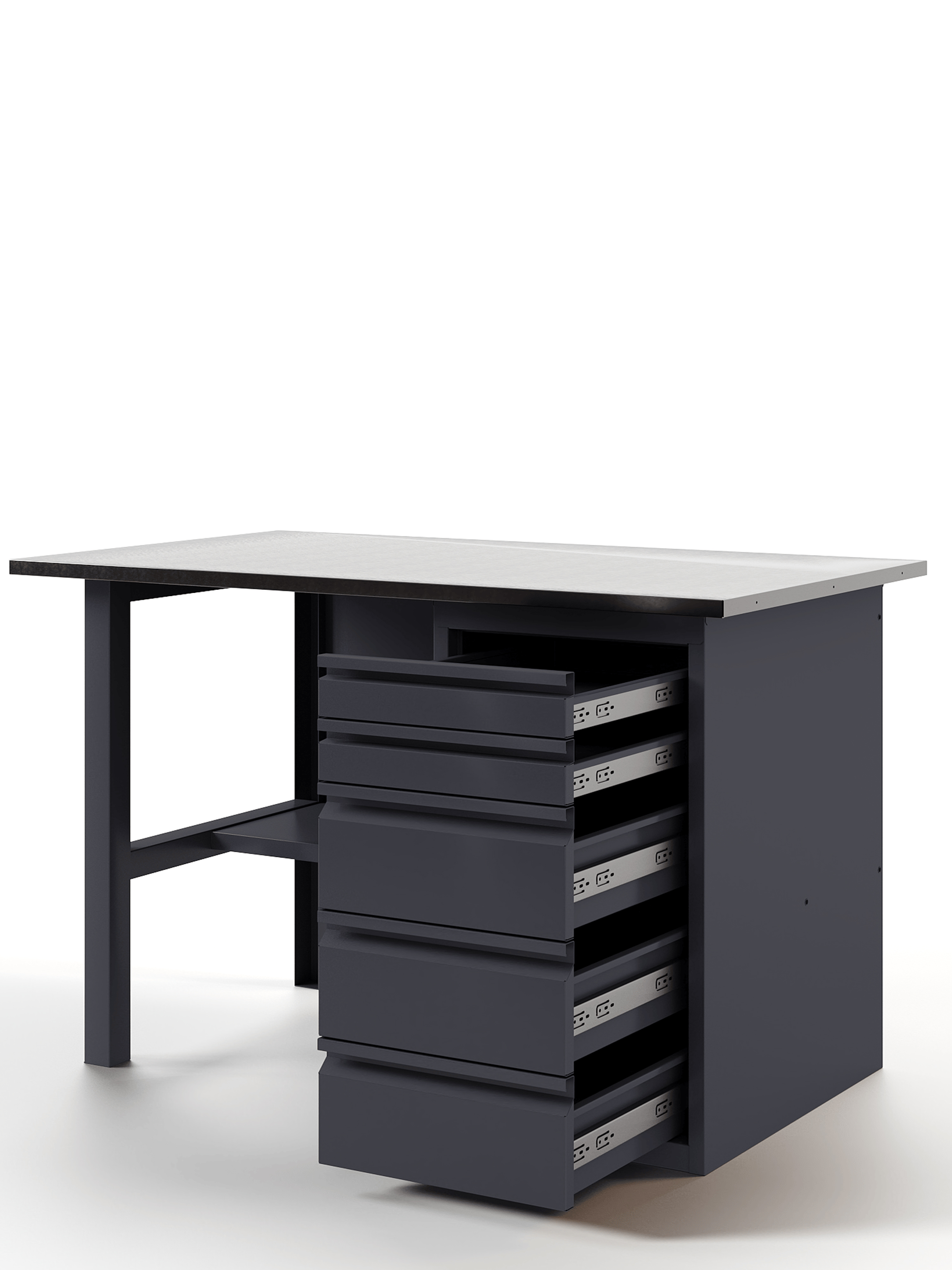 Основой верстака служит надежная столешница, выполненная из фанера толщиной 24 мм, которая закрыта коробом из оцинкованного листа толщиной 1,2 мм. Такое решение обеспечивает исключительную прочность конструкции. Столешница имеет идеально ровную поверхность без каких-либо выступающих элементов (болтов, заклепок), что создает максимальный комфорт при работе.