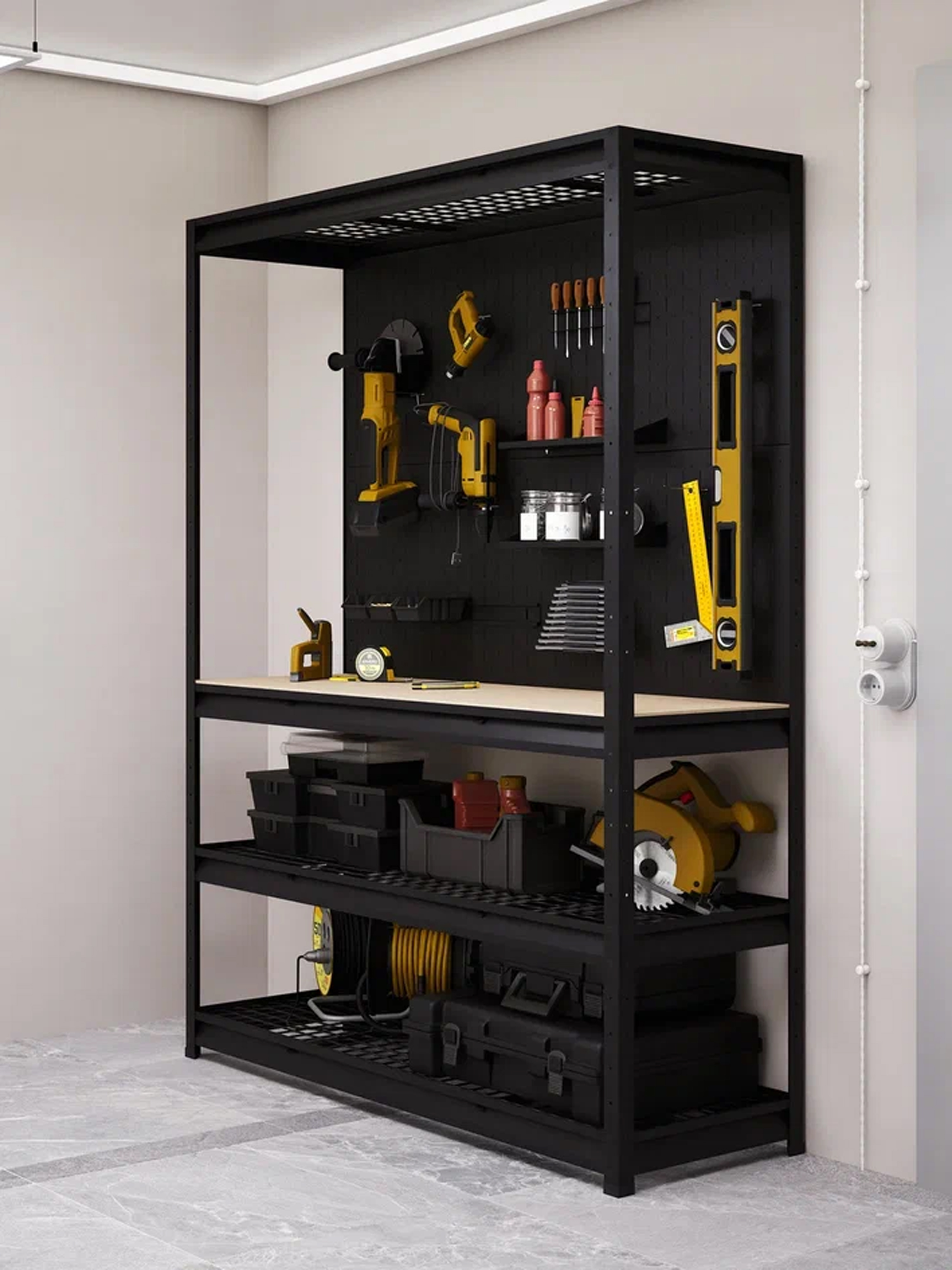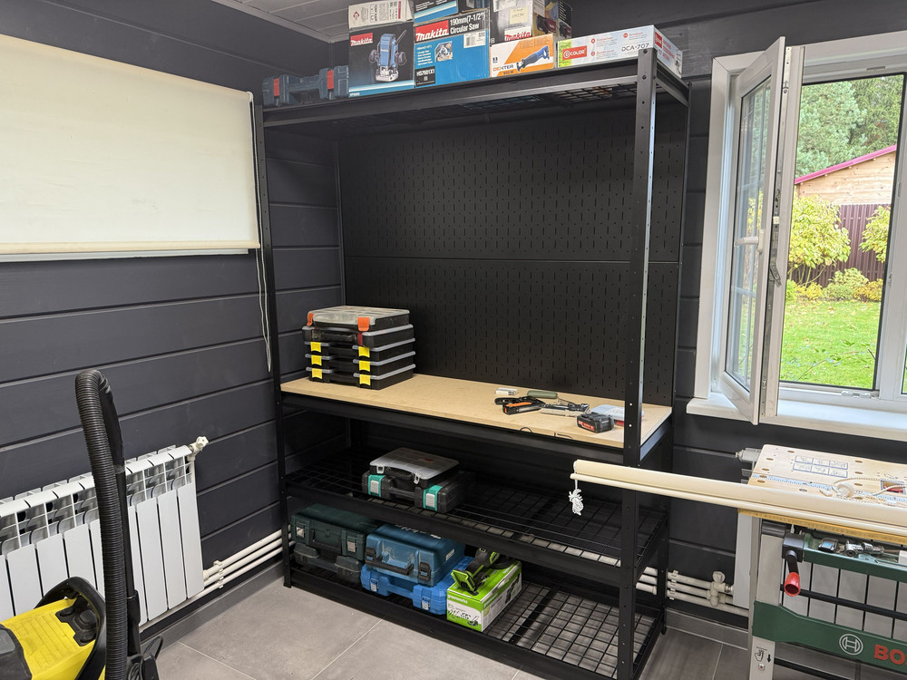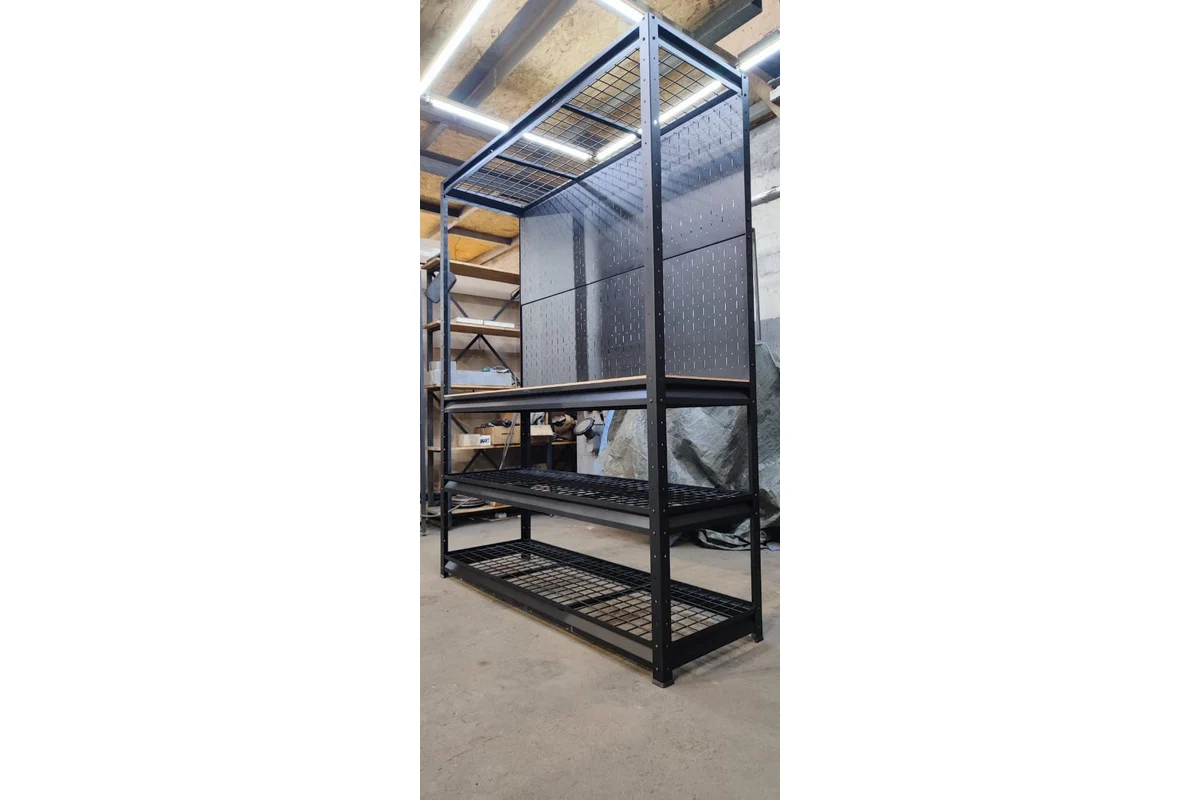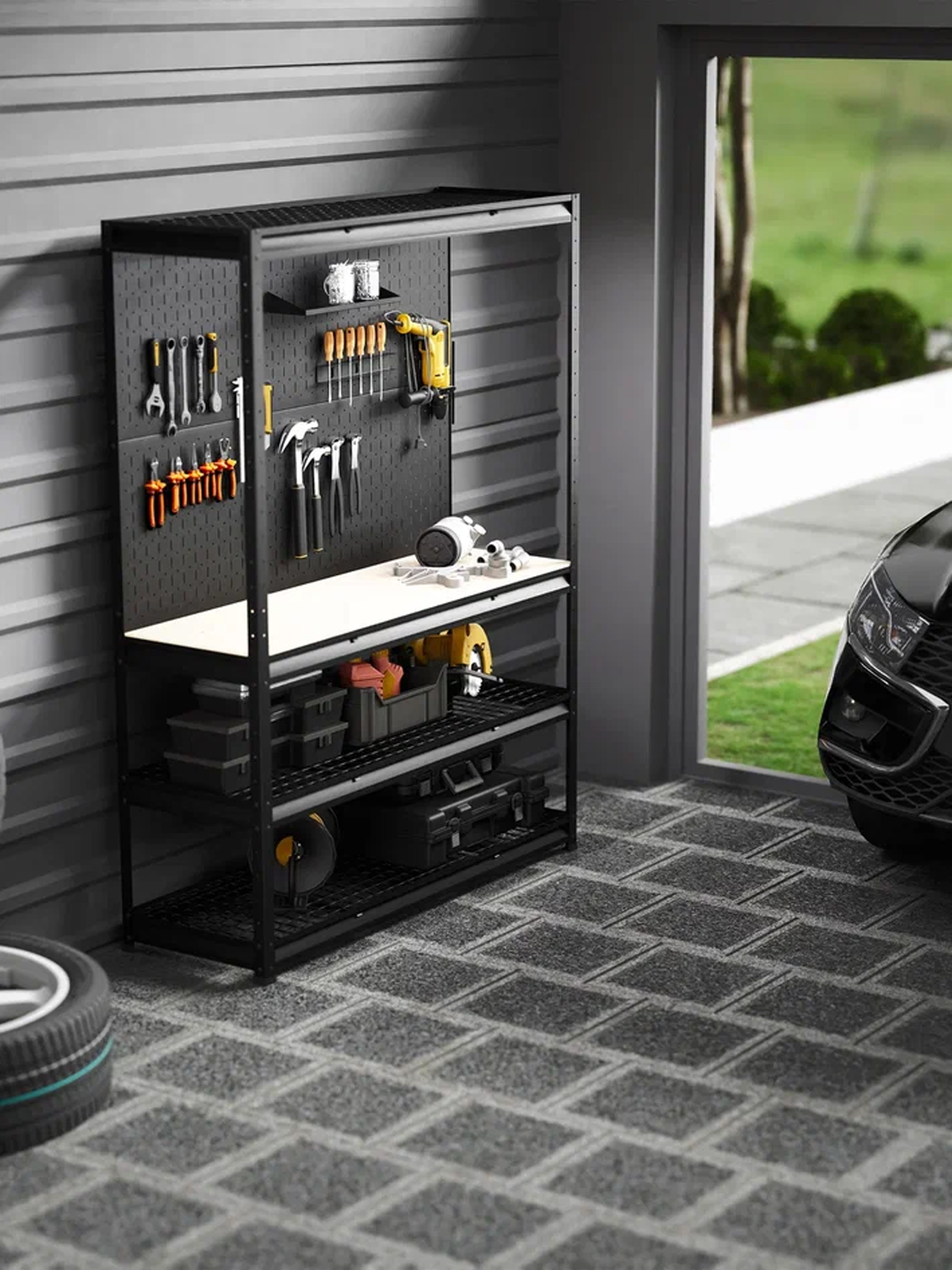 Верстак-стеллаж подходит для организации рабочего пространства в сборочных цехах, на производственных площадках, в гараже или мастерской.